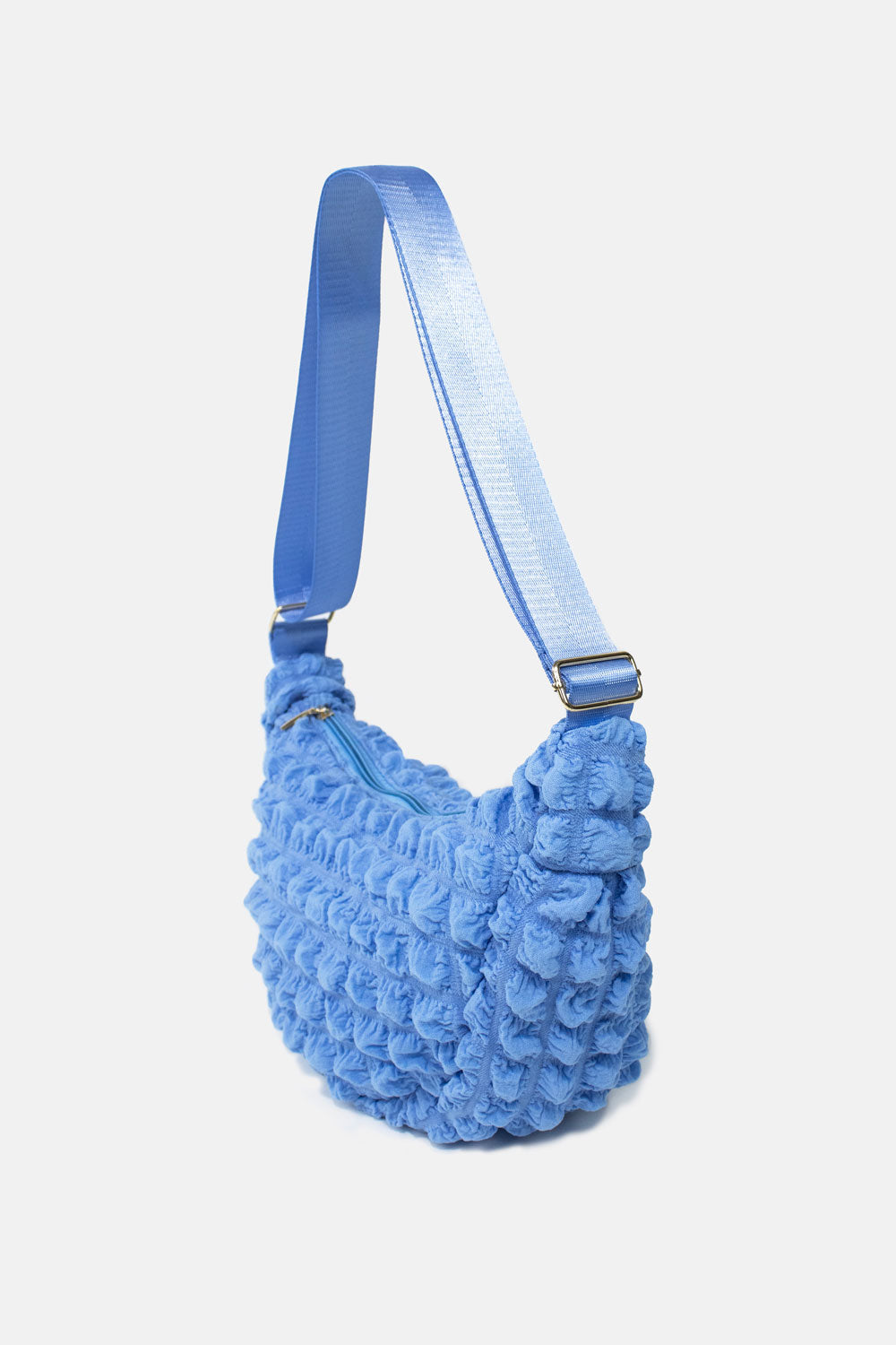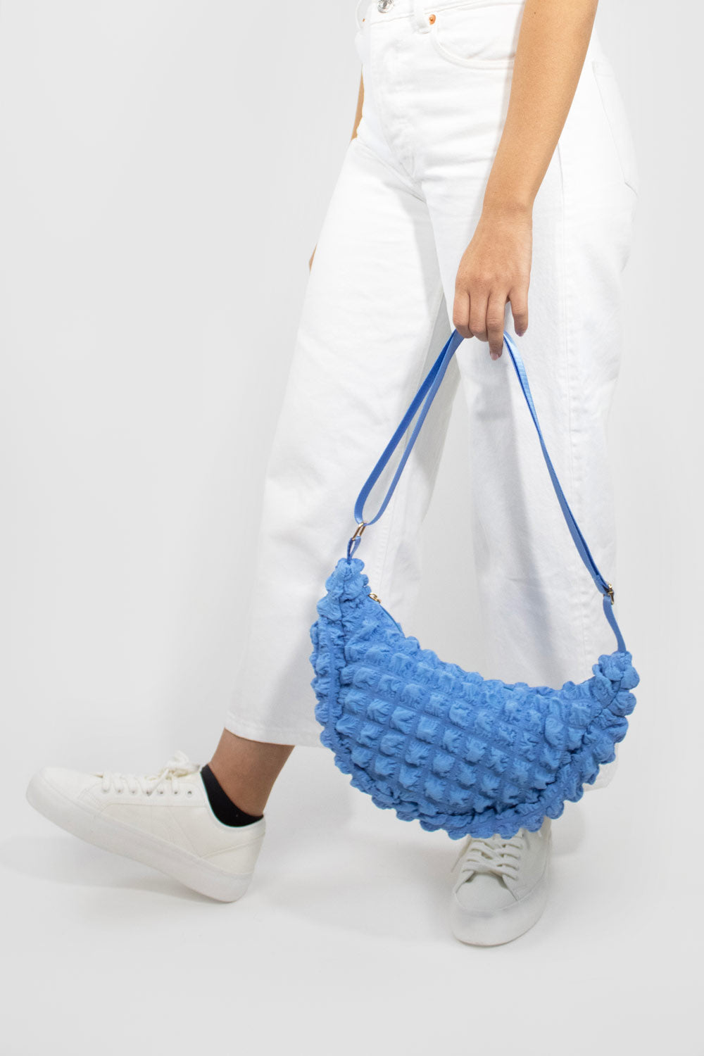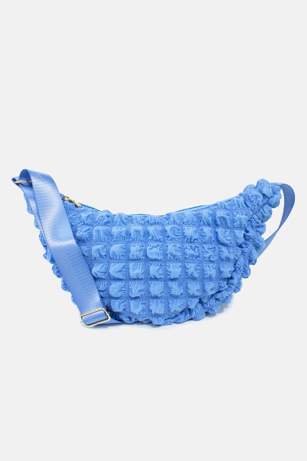 A waffle-textured sleek blue crossbody designed for comfort, organisation, and all-day confidence.