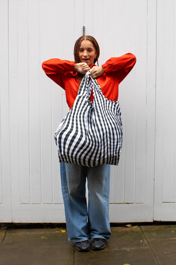 Our Extra Large Reusable Bag is designed for those who need more space. Made from 100% recycled materials, this bag can carry up to 25kg, making it perfect for large shopping trips, picnics, laundry and more. Perfect as a beach bag carrying big towels or as an essential daily errand bag, its durable construction and spacious interior ensure you have enough room for all your belongings while staying environmentally conscious.