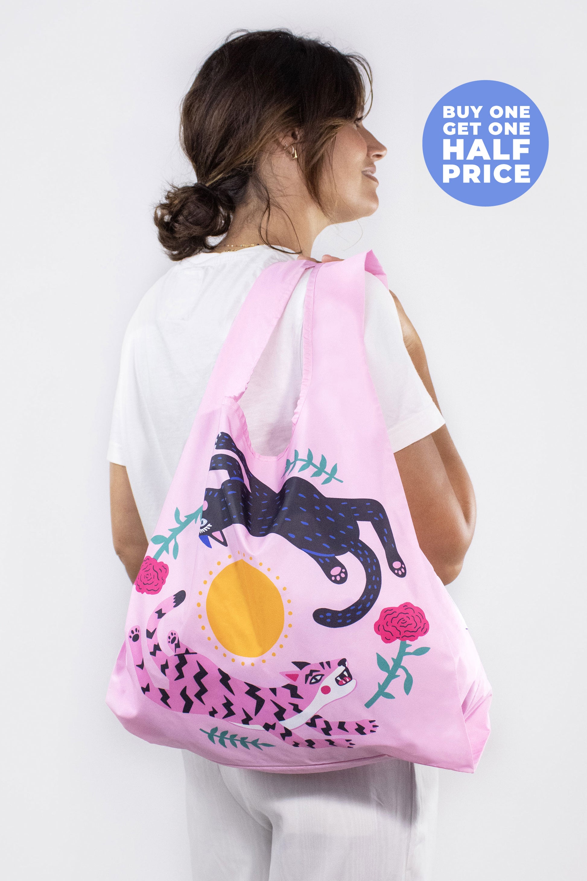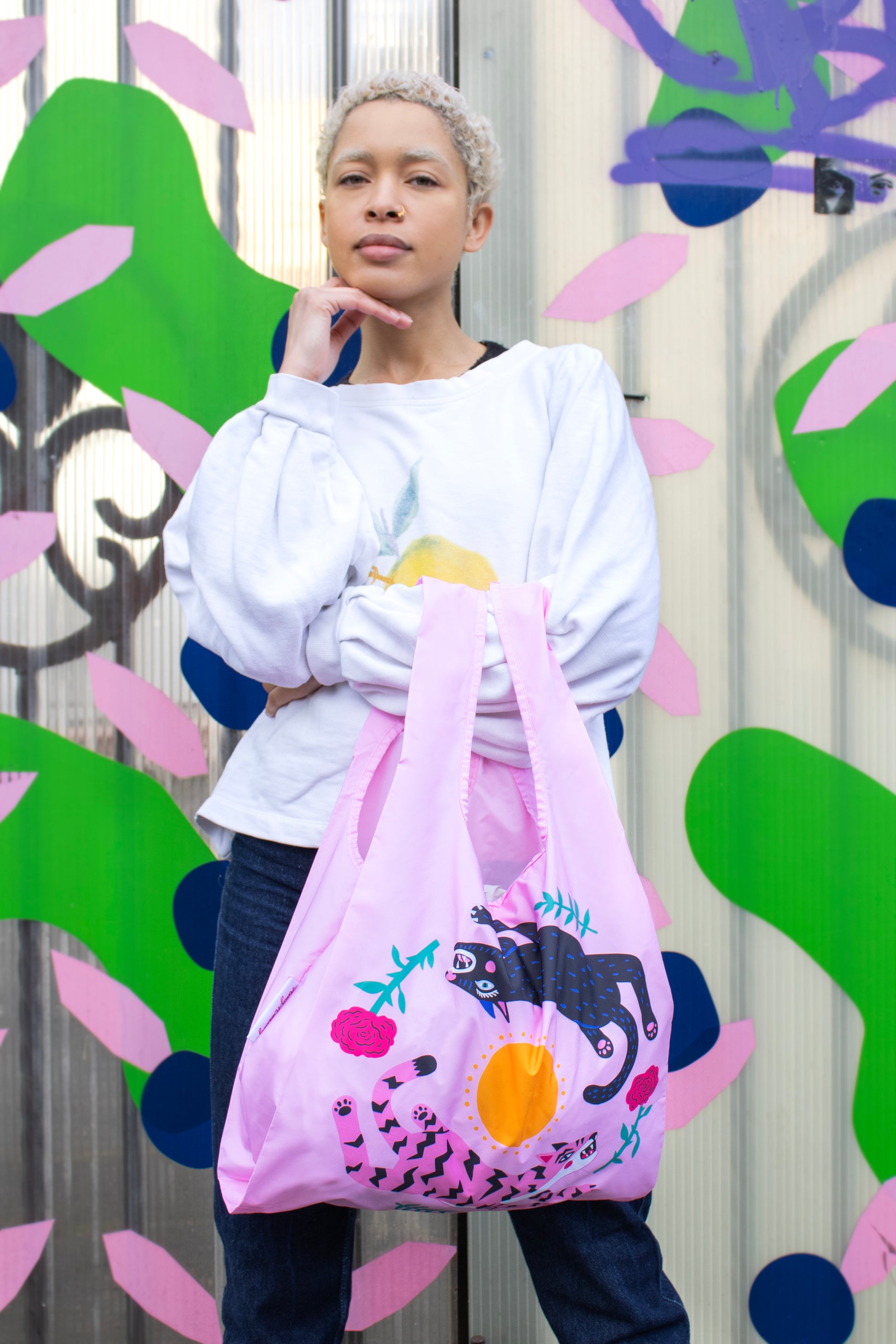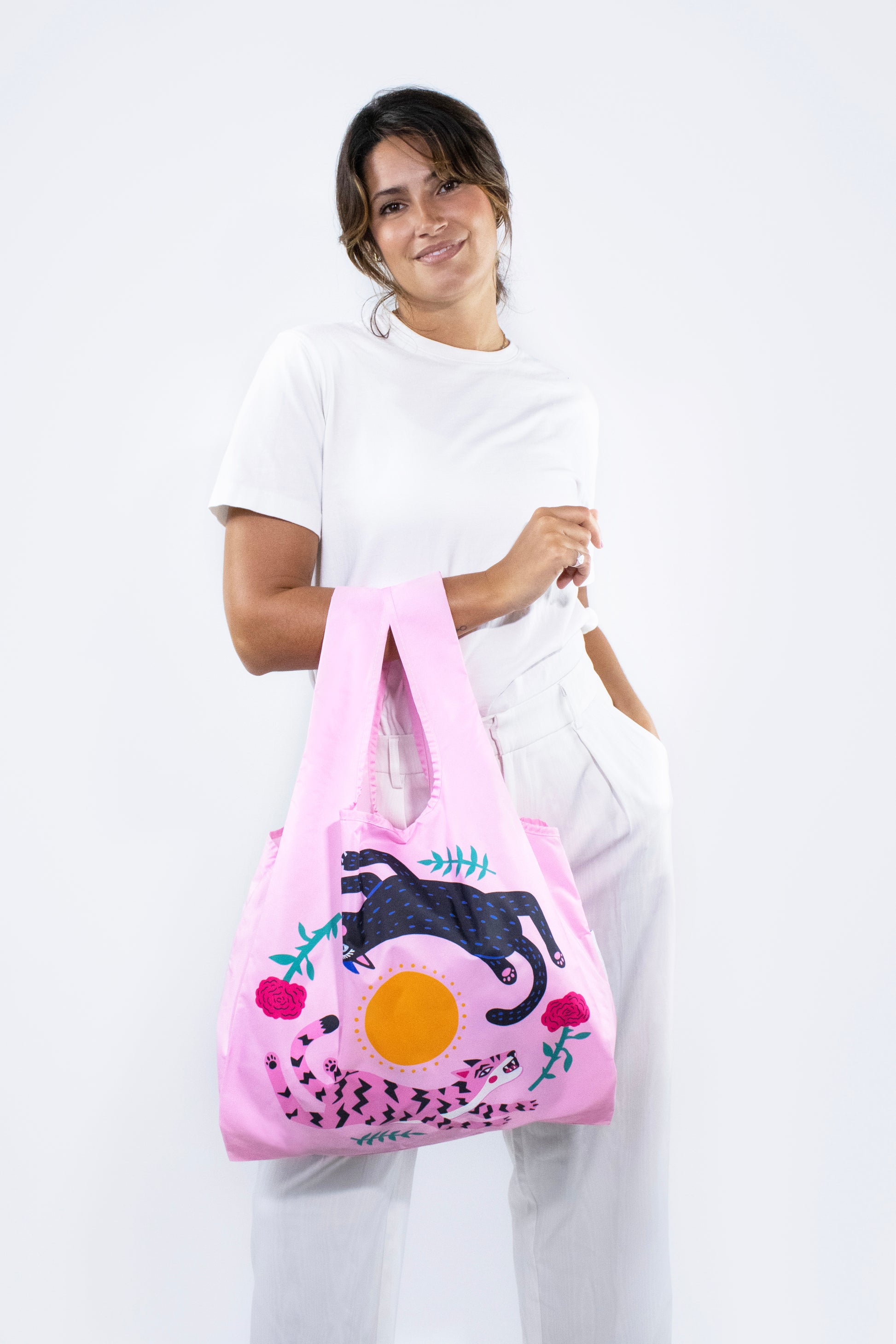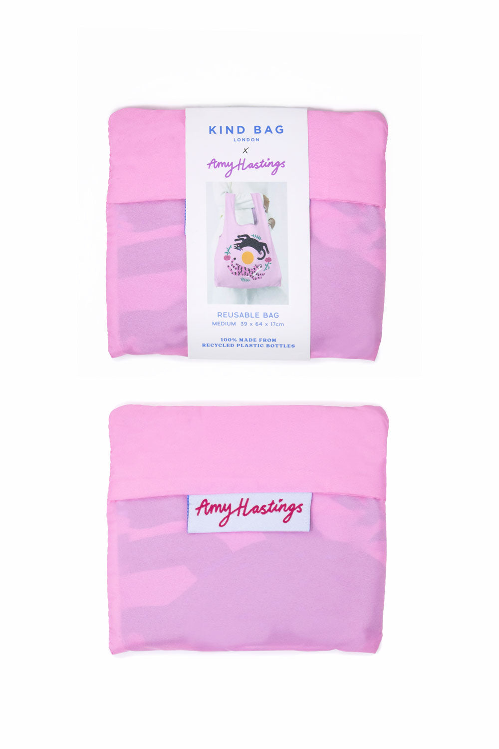 Your bag for every occasion. Lightweight, foldable, and made from recycled materials, it’s the one you’ll grab for groceries, errands, or weekends away — strong enough for heavy loads, yet compact enough to slip in your pocket. Designed in collaboration with British artist Amy Hastings, it captures her love of pink, playful kitsch, and joyful nostalgia — a reusable that’s as fun as it is functional.