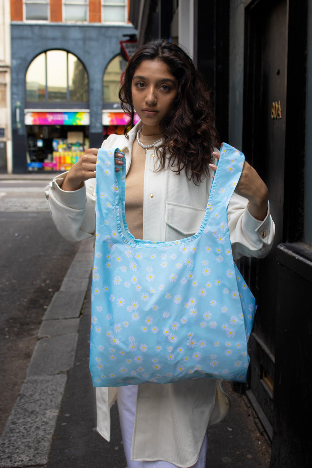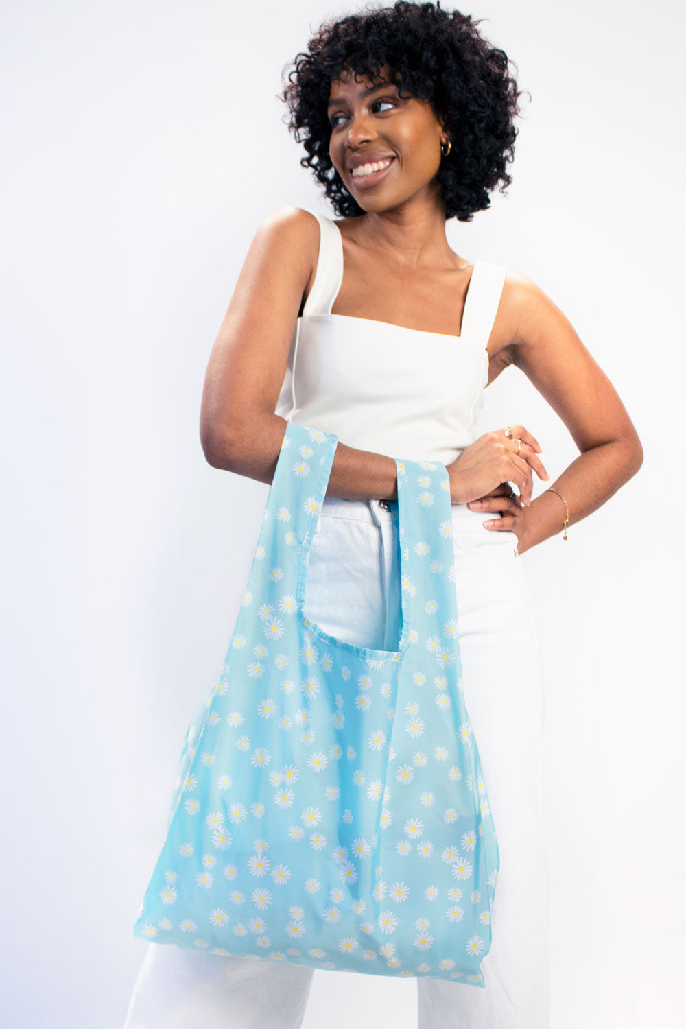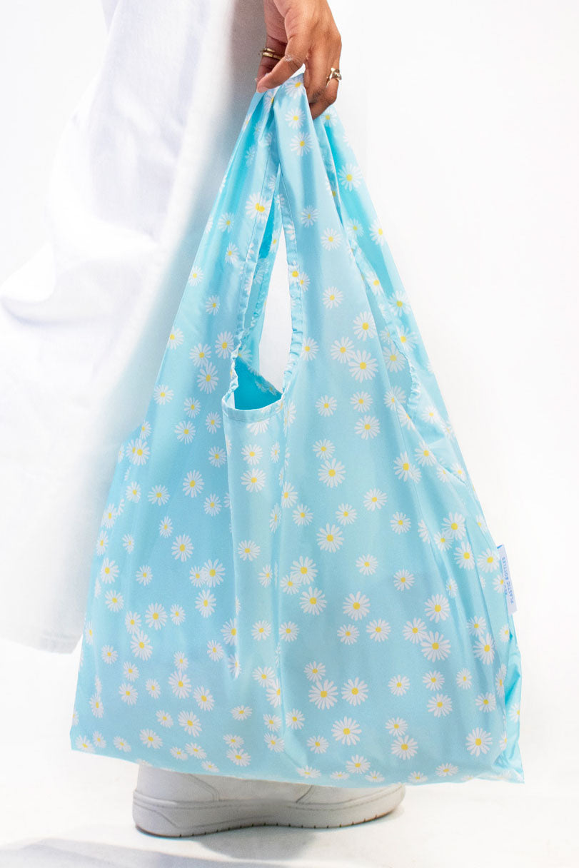 Fresh and floral, the Daisy Blue print adds a cheerful touch to your everyday. Lightweight, foldable, and durable, this medium reusable bag is perfect for grocery runs, errands, or weekends away — strong enough for heavy loads yet compact enough to slip in your pocket.