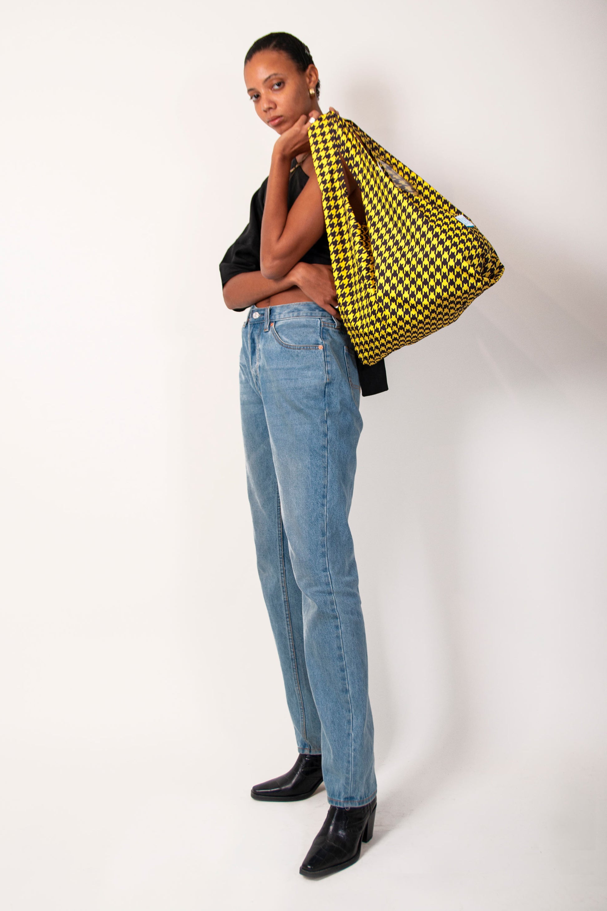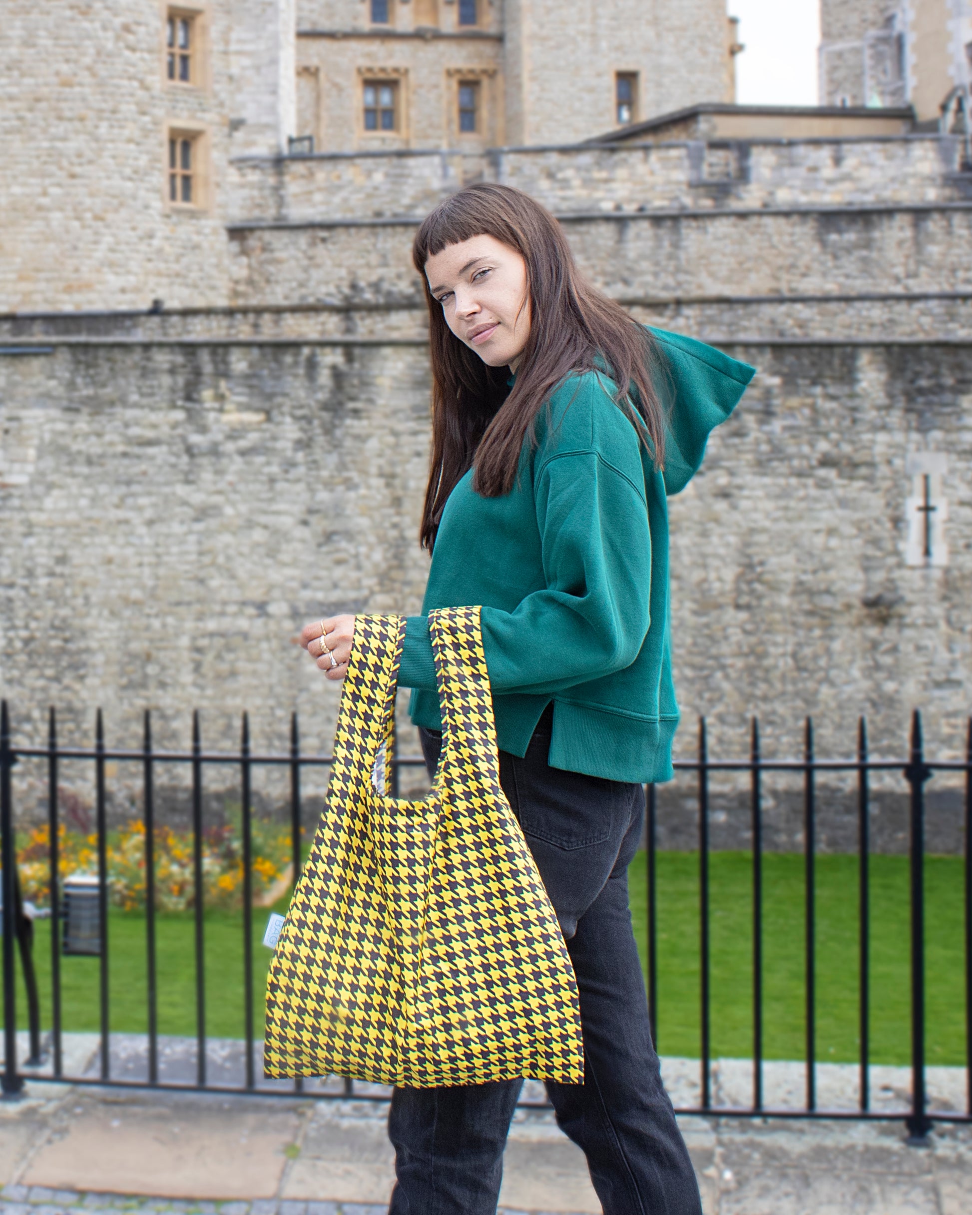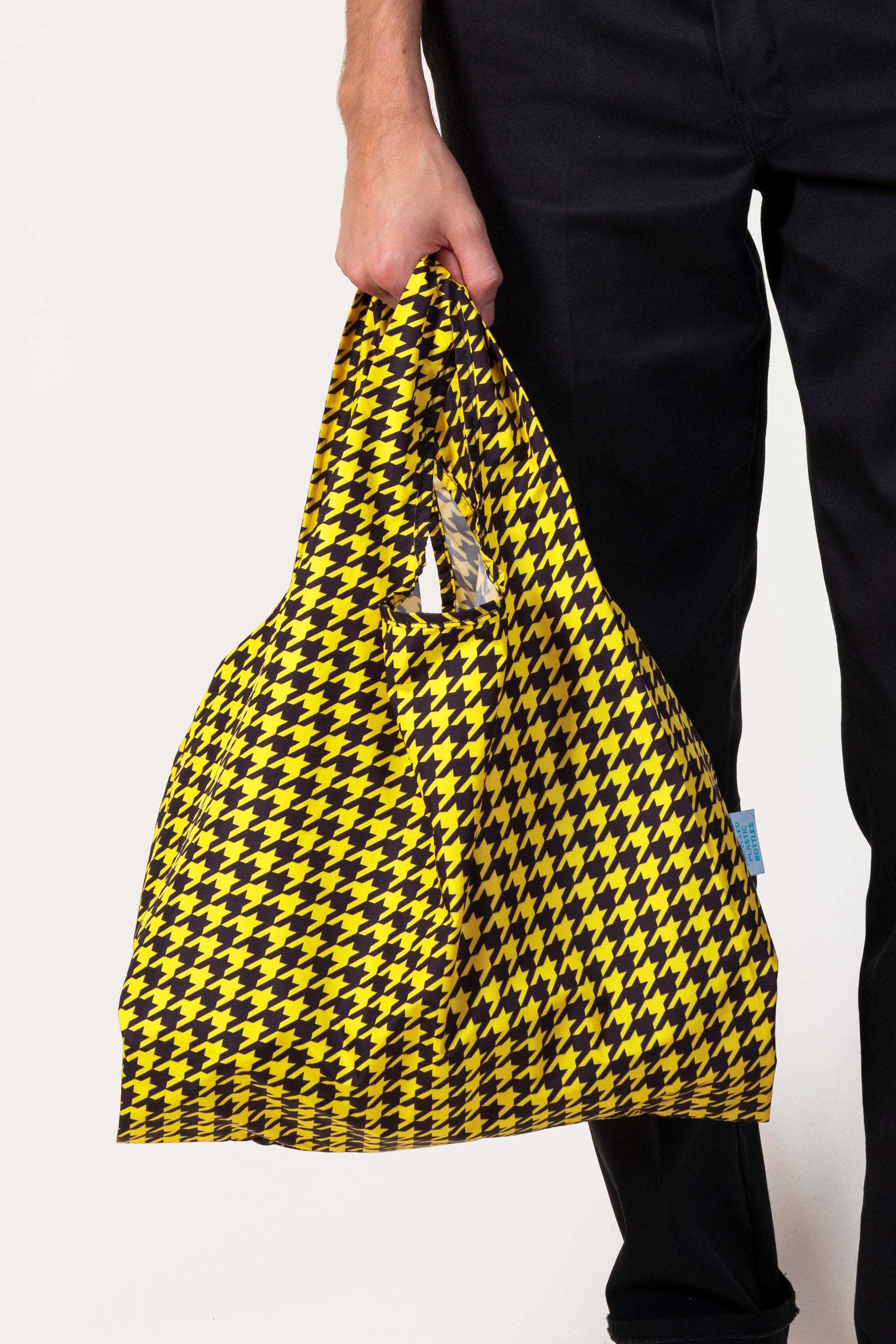 The Dogtooth print brings a bold, graphic edge to your everyday. Lightweight, foldable, and durable, this medium reusable bag is perfect for grocery runs, errands, or weekends away — strong enough for heavy loads yet compact enough to slip in your pocket