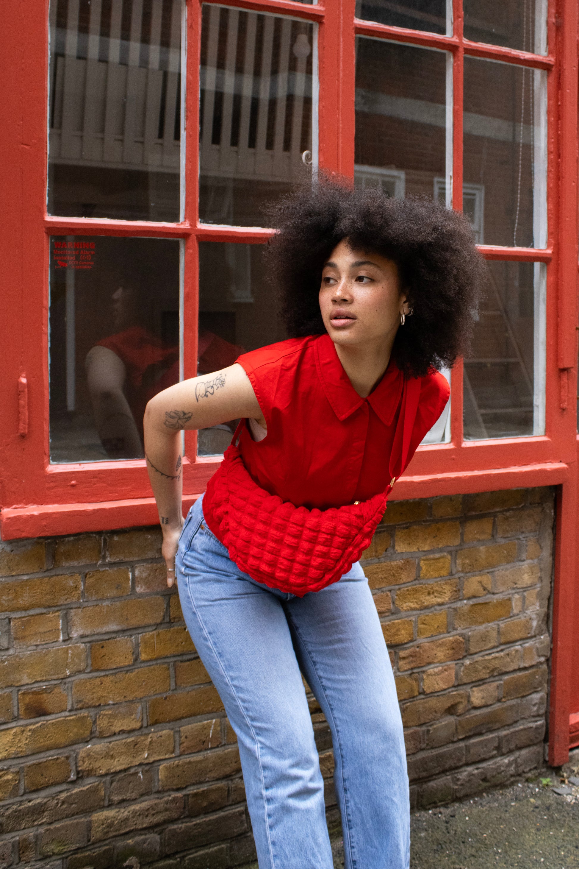 A waffle-textured sleek red crossbody designed for comfort, organisation, and all-day confidence.